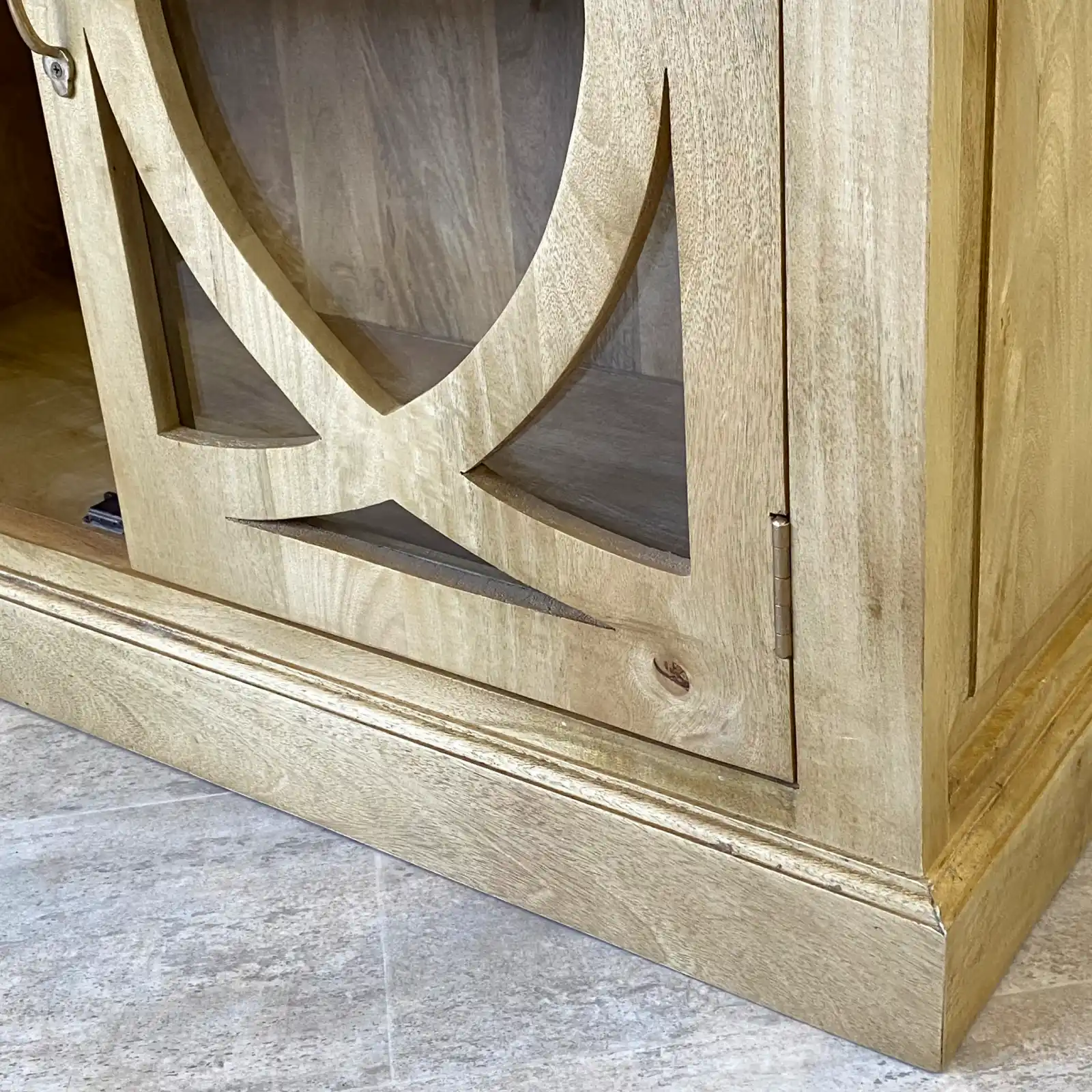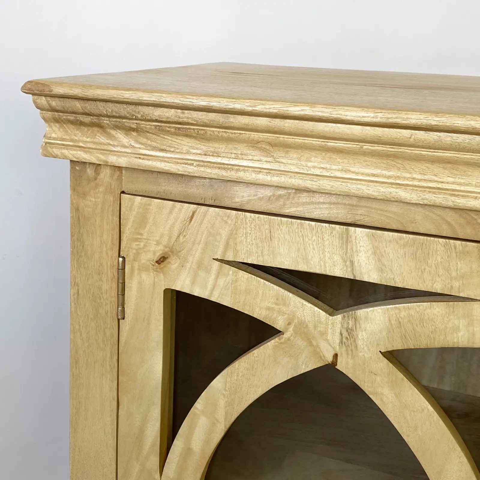 Pero lo mejor es que, puedes lucir tu vajilla favorita o tus libros sin que el mueble se sienta pesado en la estancia. La madera de mango natural tiene ese tono cálido que combina con todo y, gracias a los detalles de las molduras, consigue que cualquier pared vacía se convierta en un rincón con personalidad.