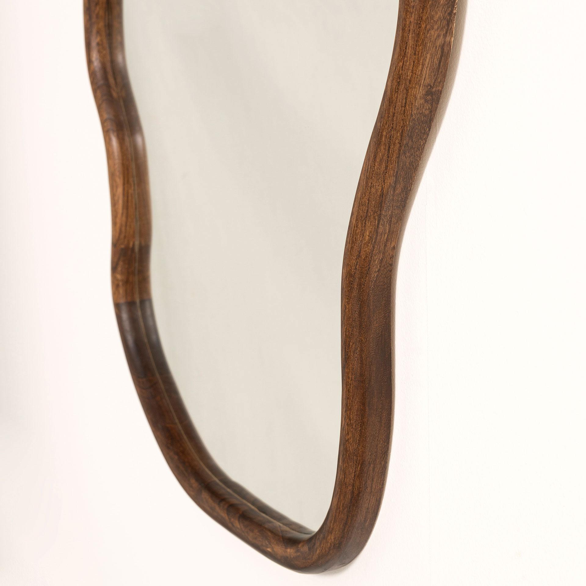 Espejo irregular (90x60cm) en madera de nogal tonalidad oscura. Puede colgarse en vertical / horizontal.