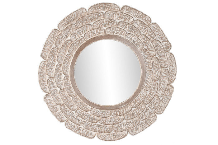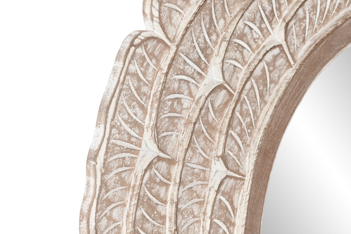 Espejo en madera de mango color blanco decapé con grabados de formas sinuosas similares a los pétalos de una flor
