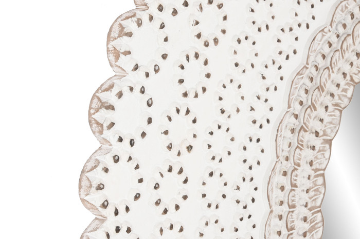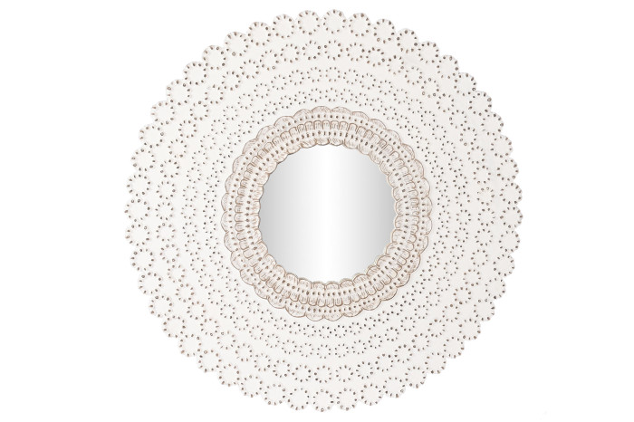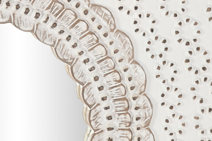 Espejo redondo de MDF en color blanco decapado, con patrones dinámicos tallados