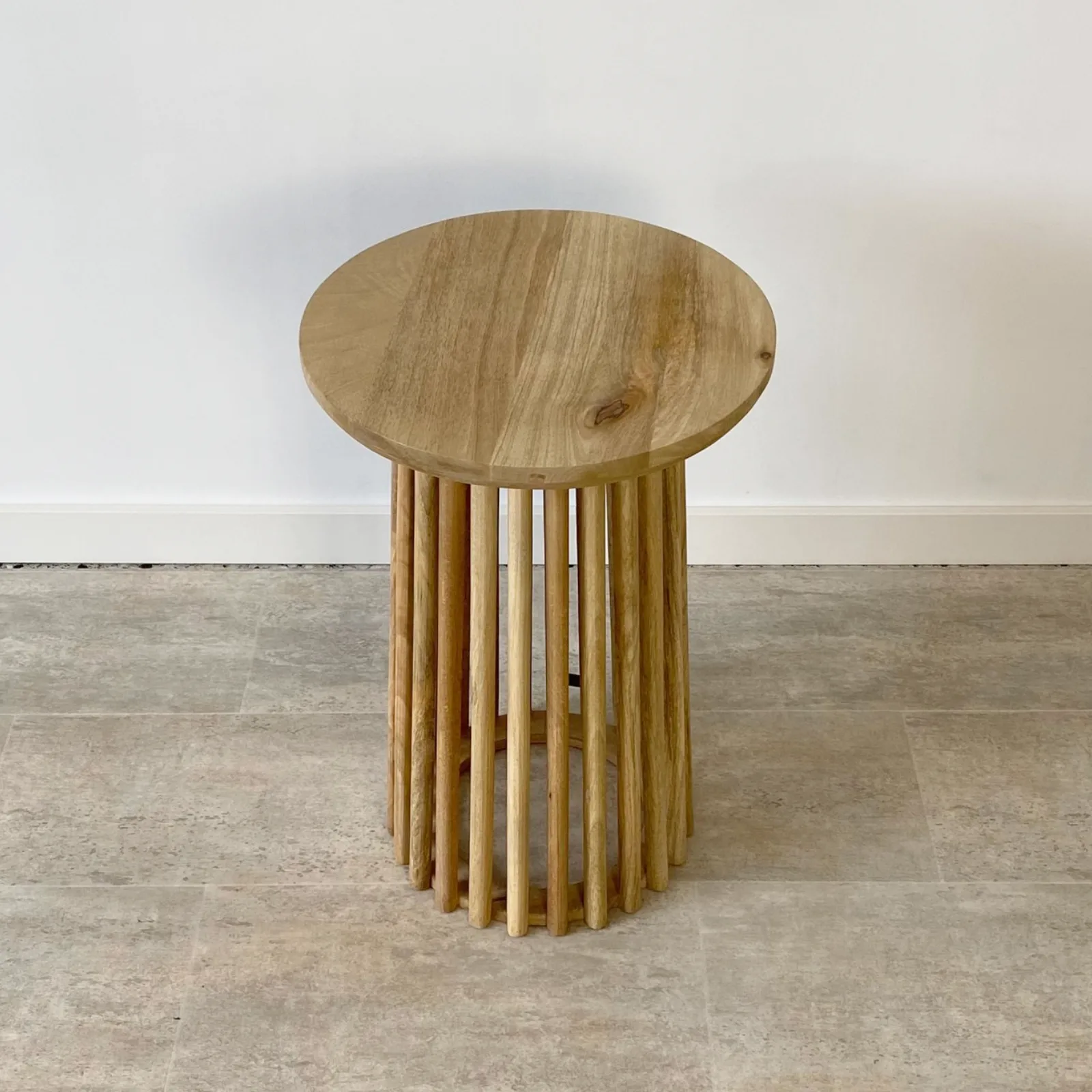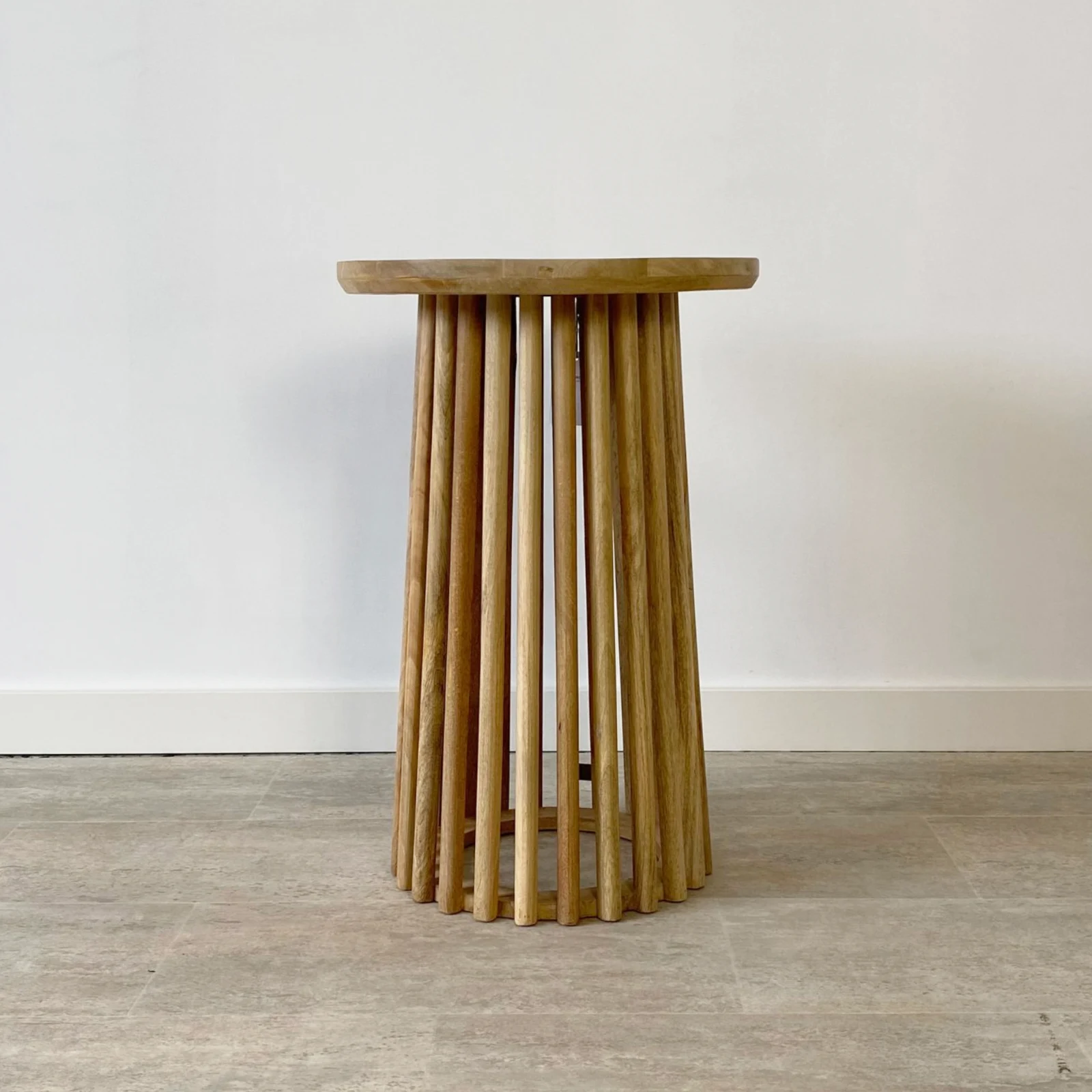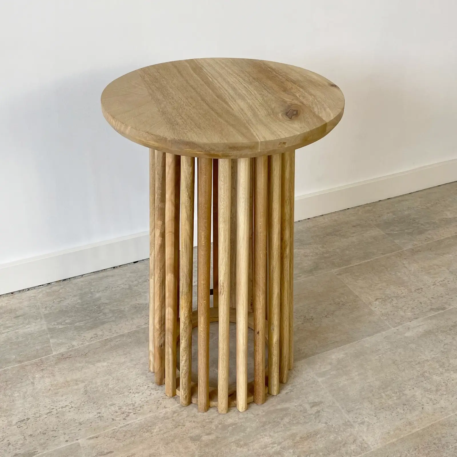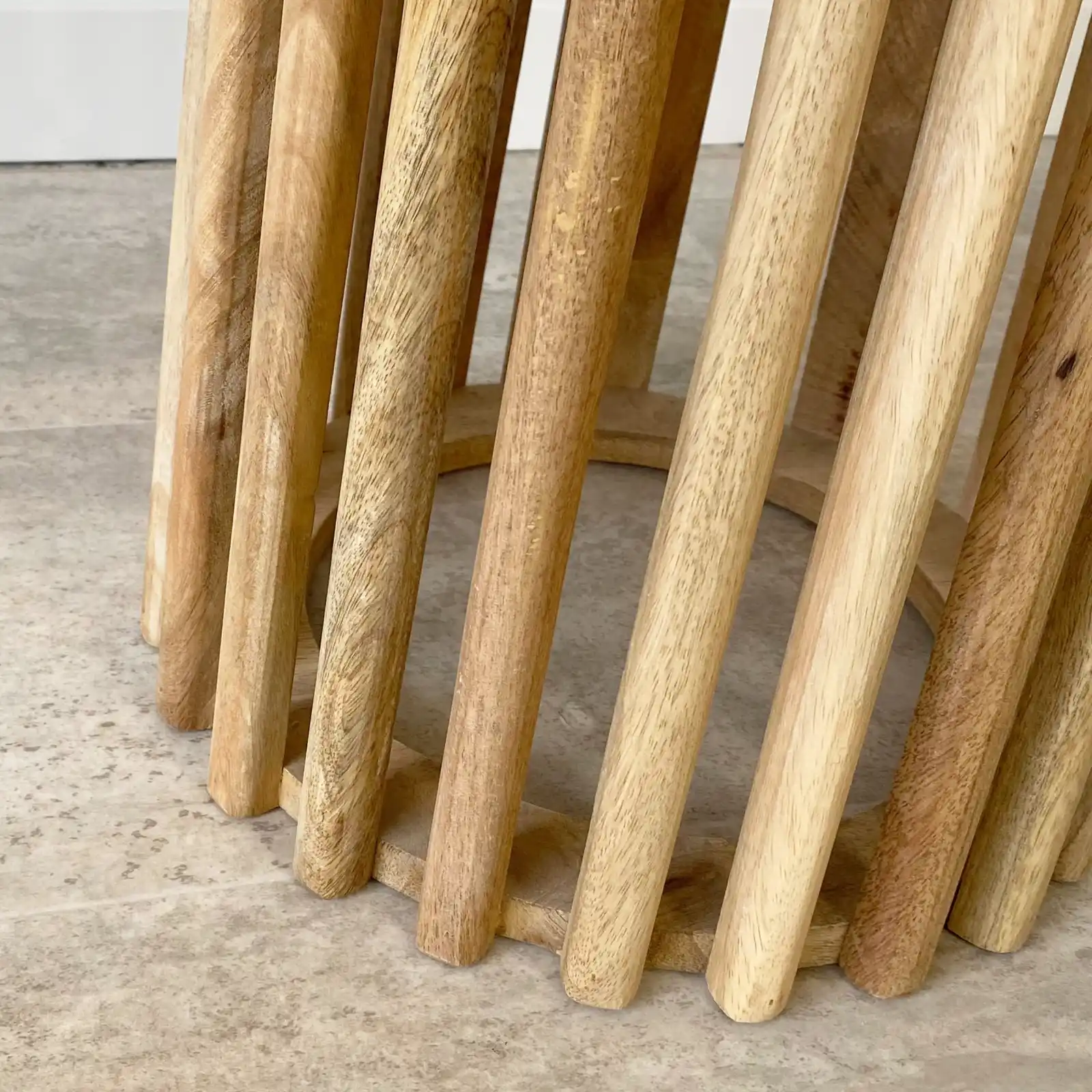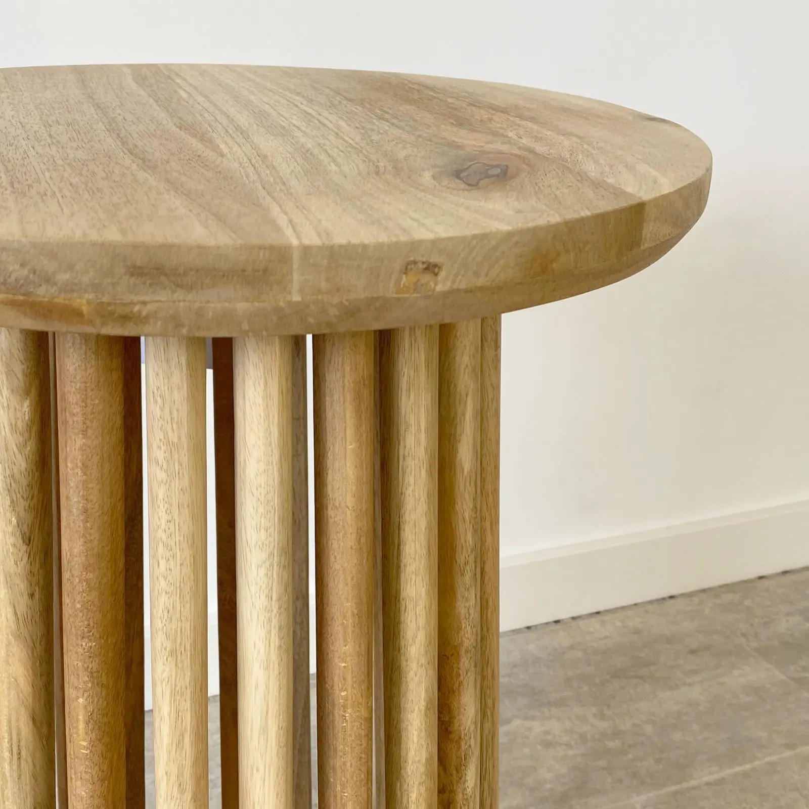 Esta mesa auxiliar redonda en madera de mango color NATURAL es la compañera perfecta para añadir calidez a cualquier rincón de tu casa. Lo que más nos gusta es el diseño de su pata central: ese juego de listones de madera que no solo le da estabilidad, sino que crea un efecto visual de ligereza, convirtiéndola en una pieza con un carácter único.