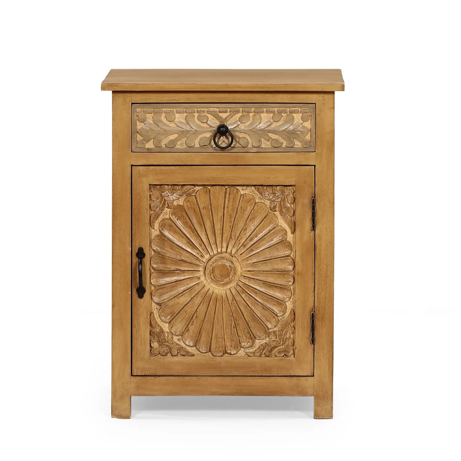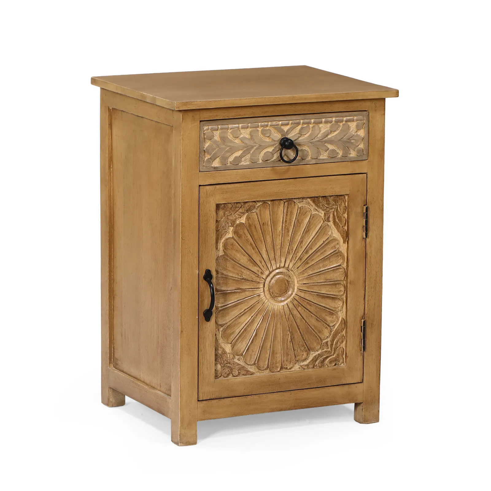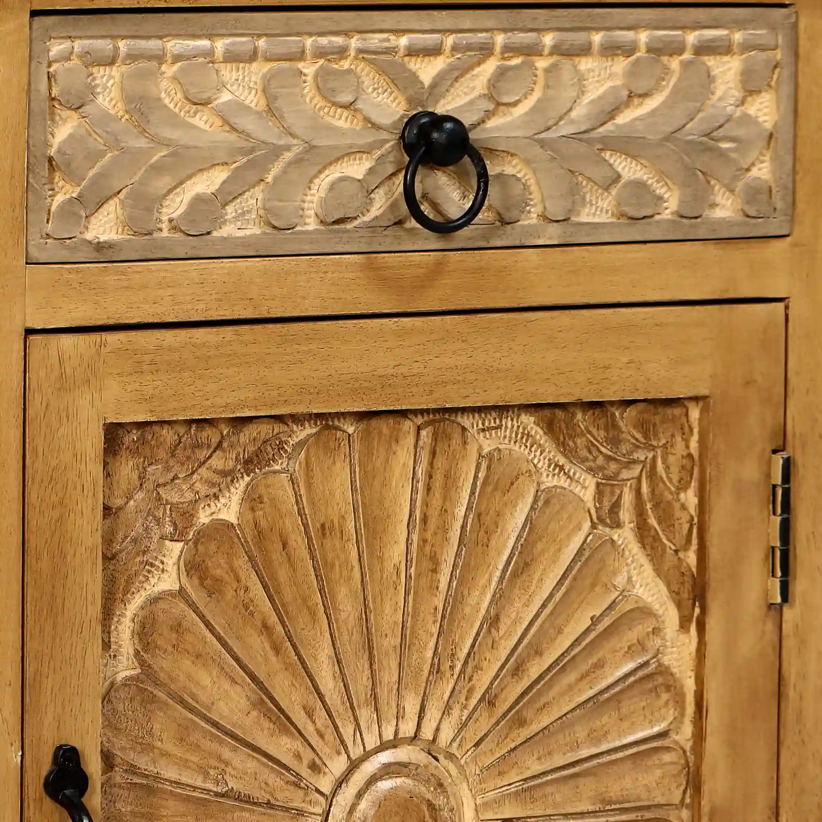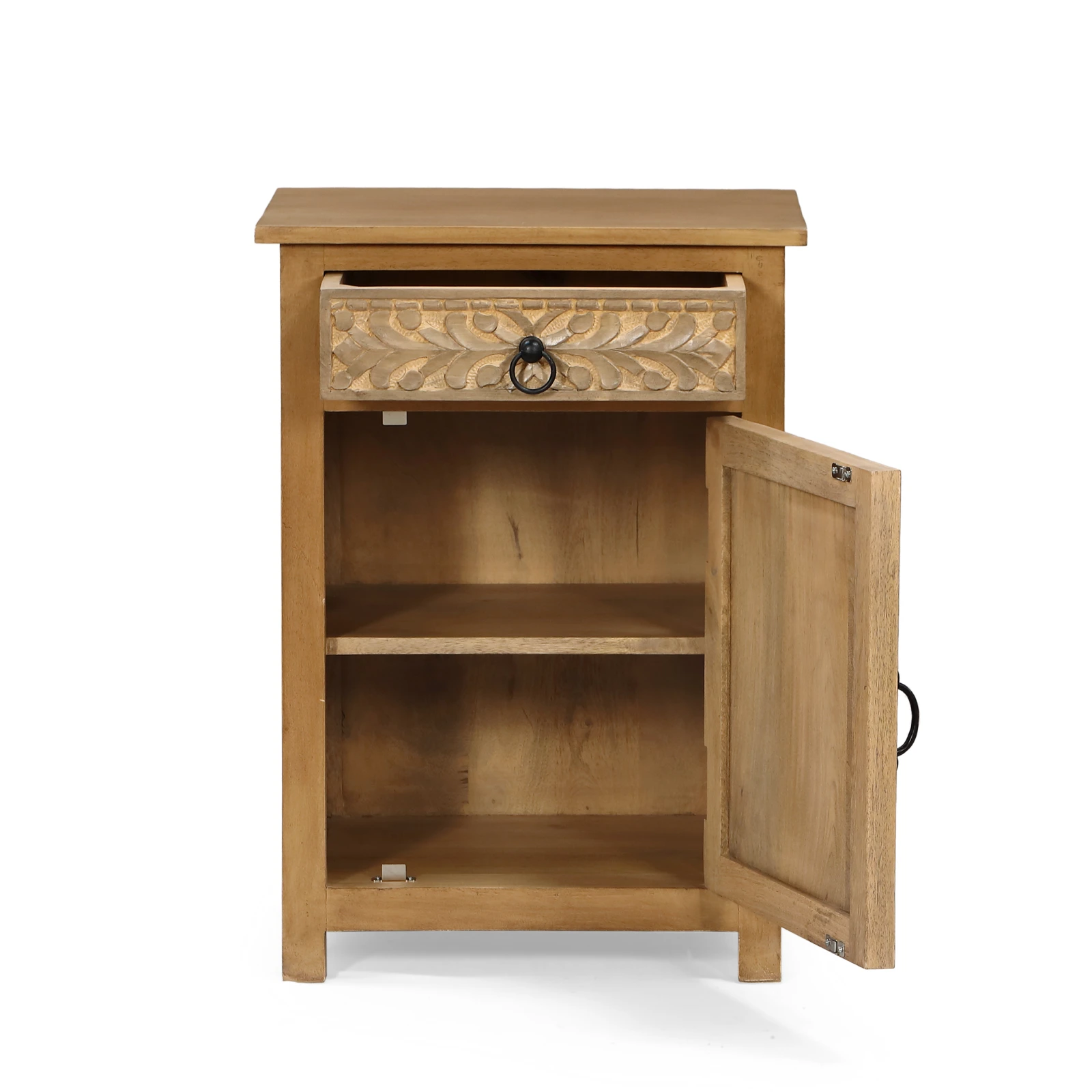 Mesita de noche en madera de mango, con cajón y puerta tallada a mano