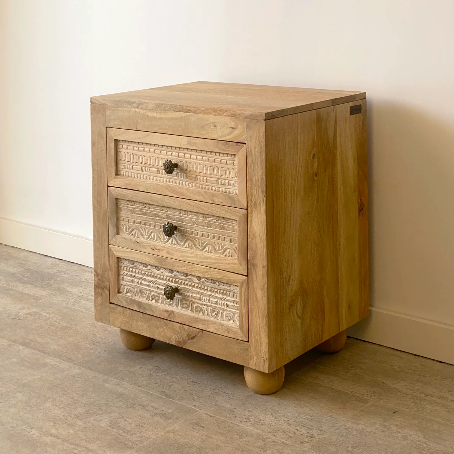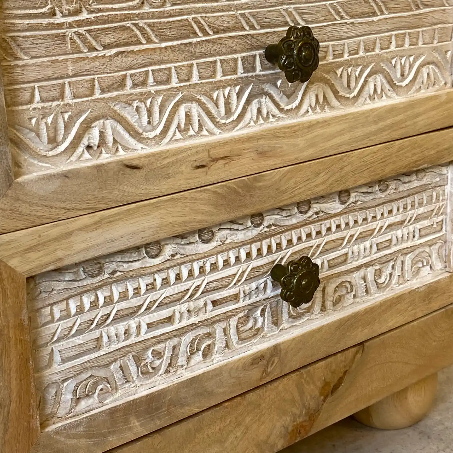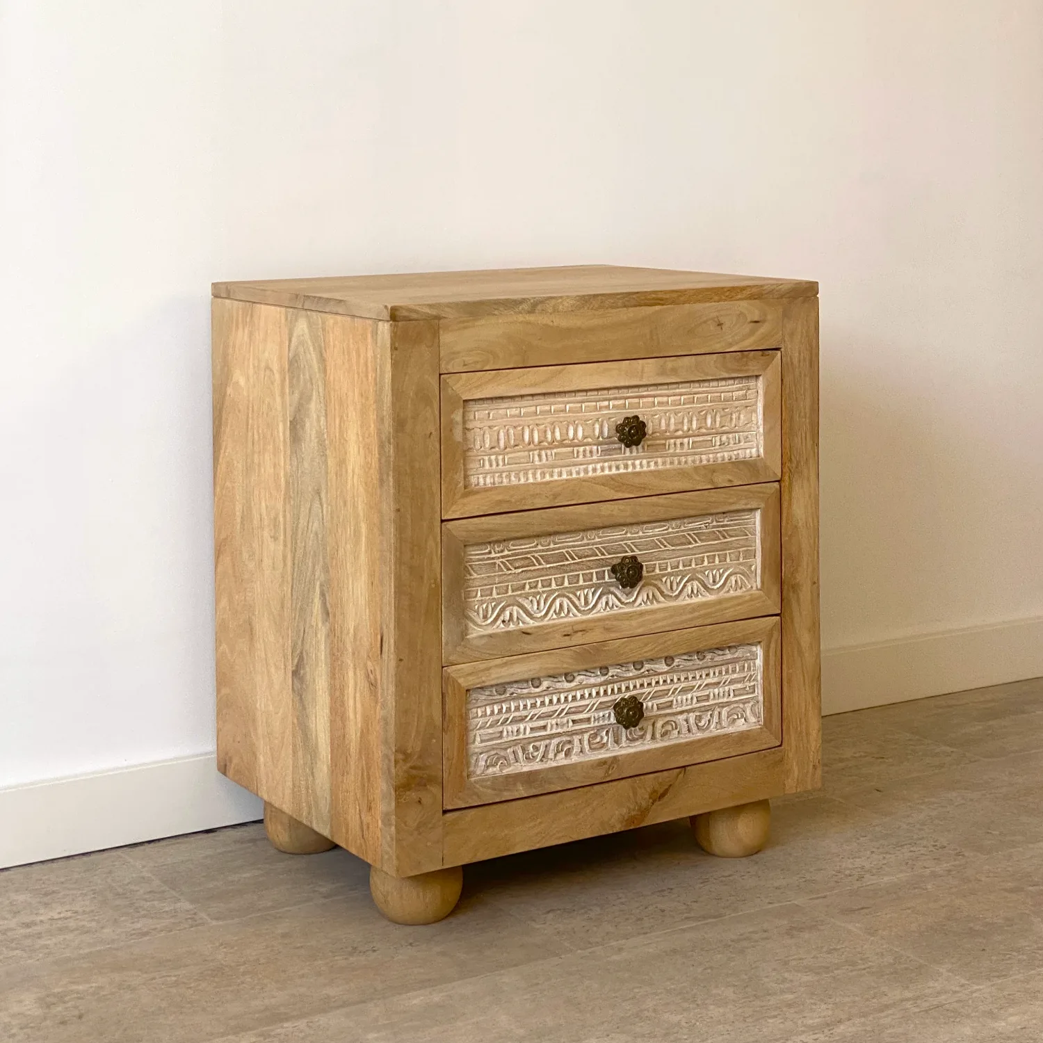 Mesita de noche en madera de mango certificada y sostenible, con detalles en blanco tallados a mano