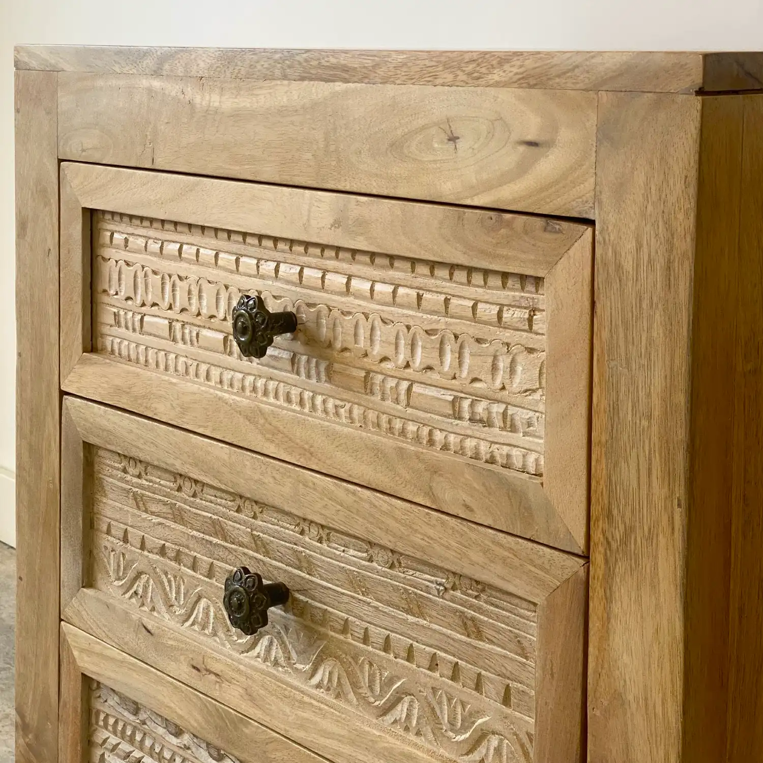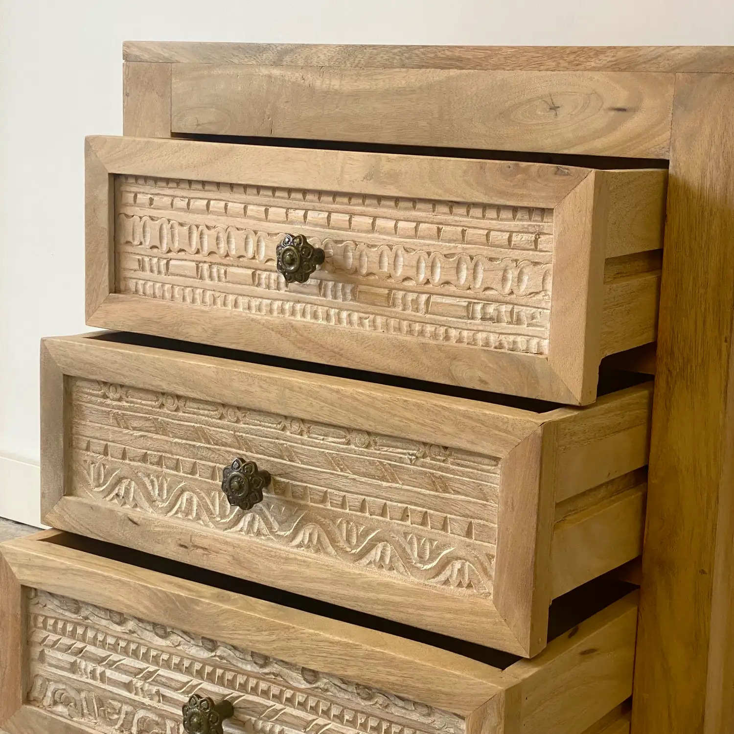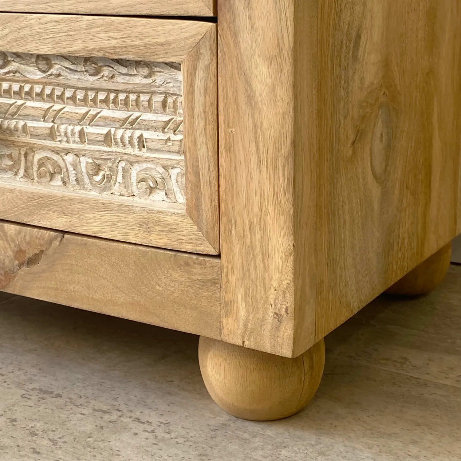Mesita de noche en madera de mango certificada y sostenible, con detalles en blanco tallados a mano