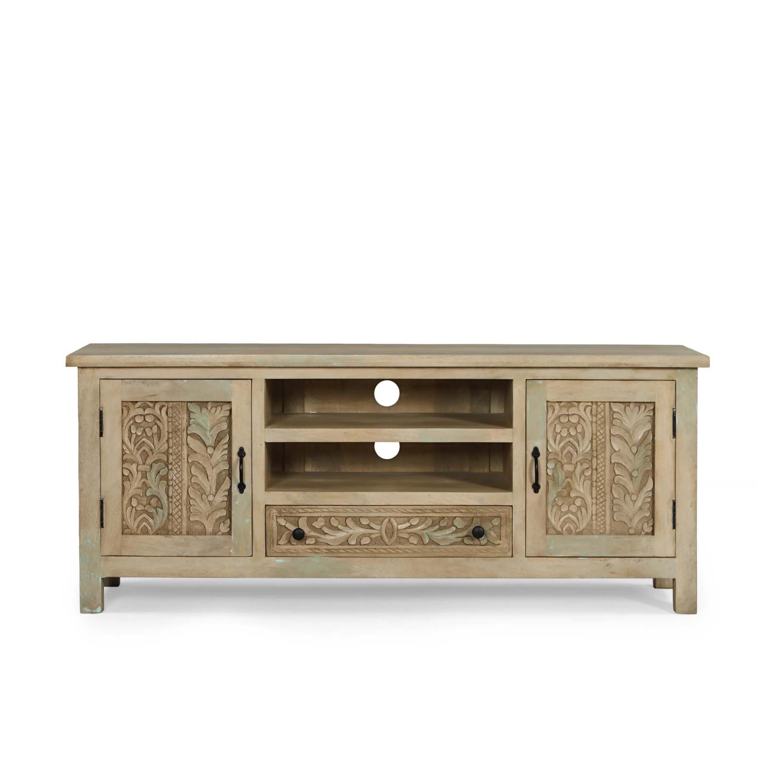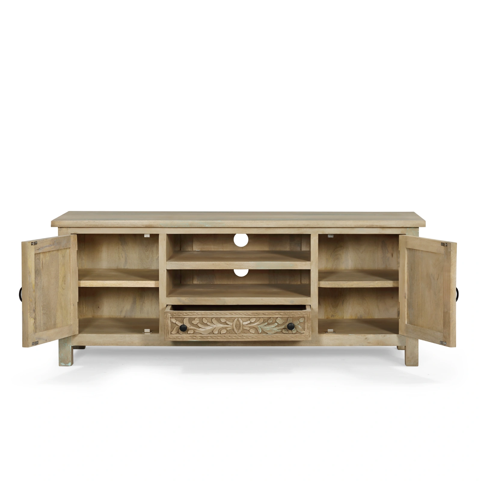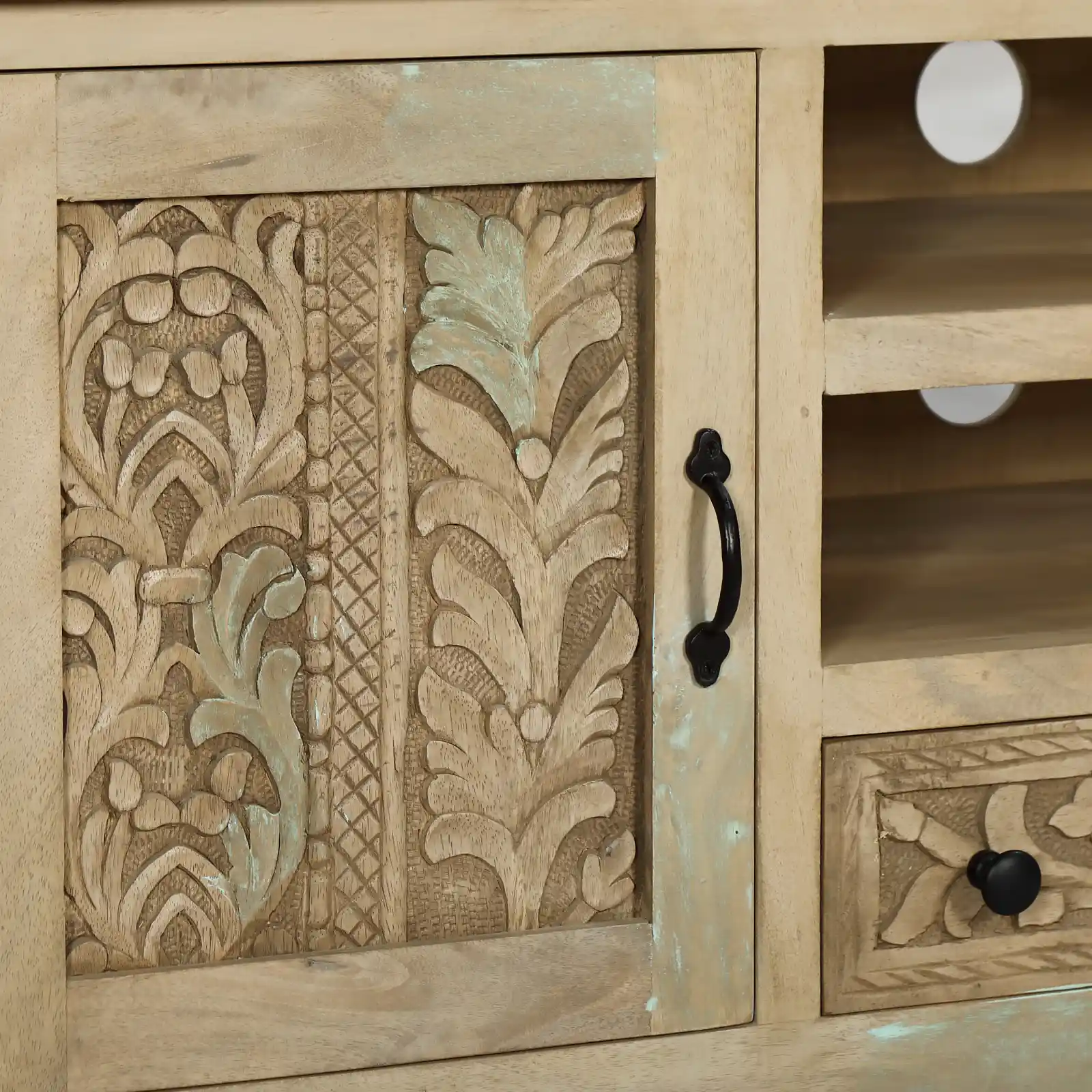 Mueble tv en madera de mango, con cajón y puertas talladas a mano