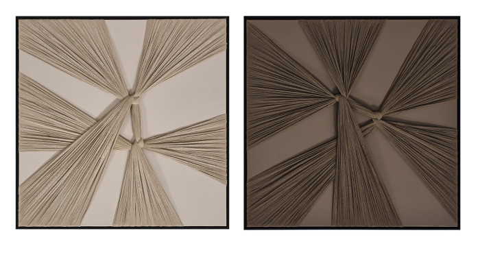 Lo que hace especial a este set de 2 cuadros beige y marrón son las telas entrelazadas formando pequeños nudos. Al combinar un lienzo en beige con otro en marrón oscuro, consiguen ese equilibrio perfecto de los tonos tierra: uno aporta la luminosidad y el otro le da la fuerza y el contraste necesario para que el conjunto tenga presencia.