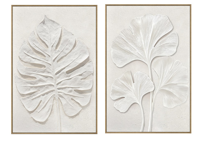 Set de 2 cuadros en lienzo con hojas en relieve efecto 3D, tonalidades neutras de beige y blanco