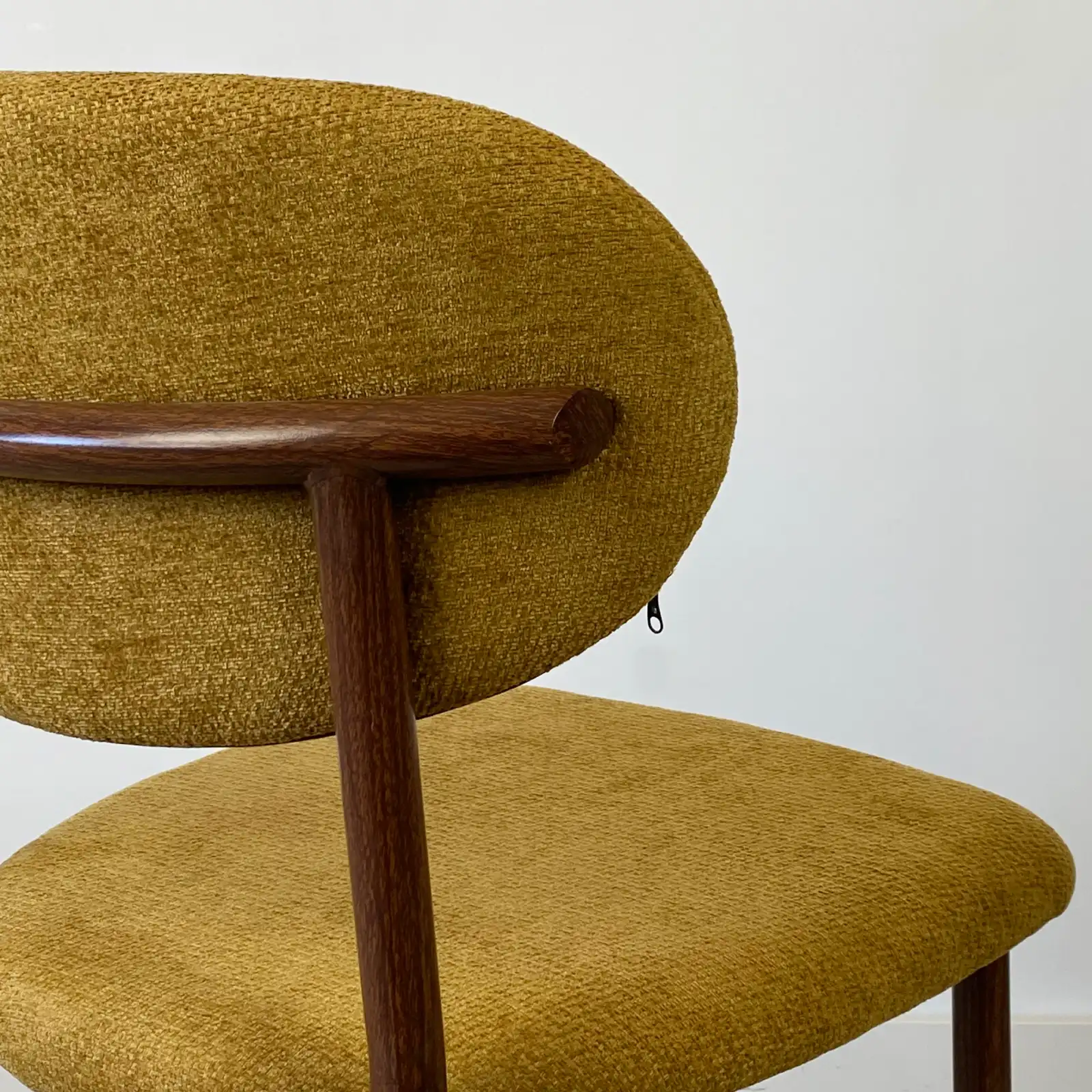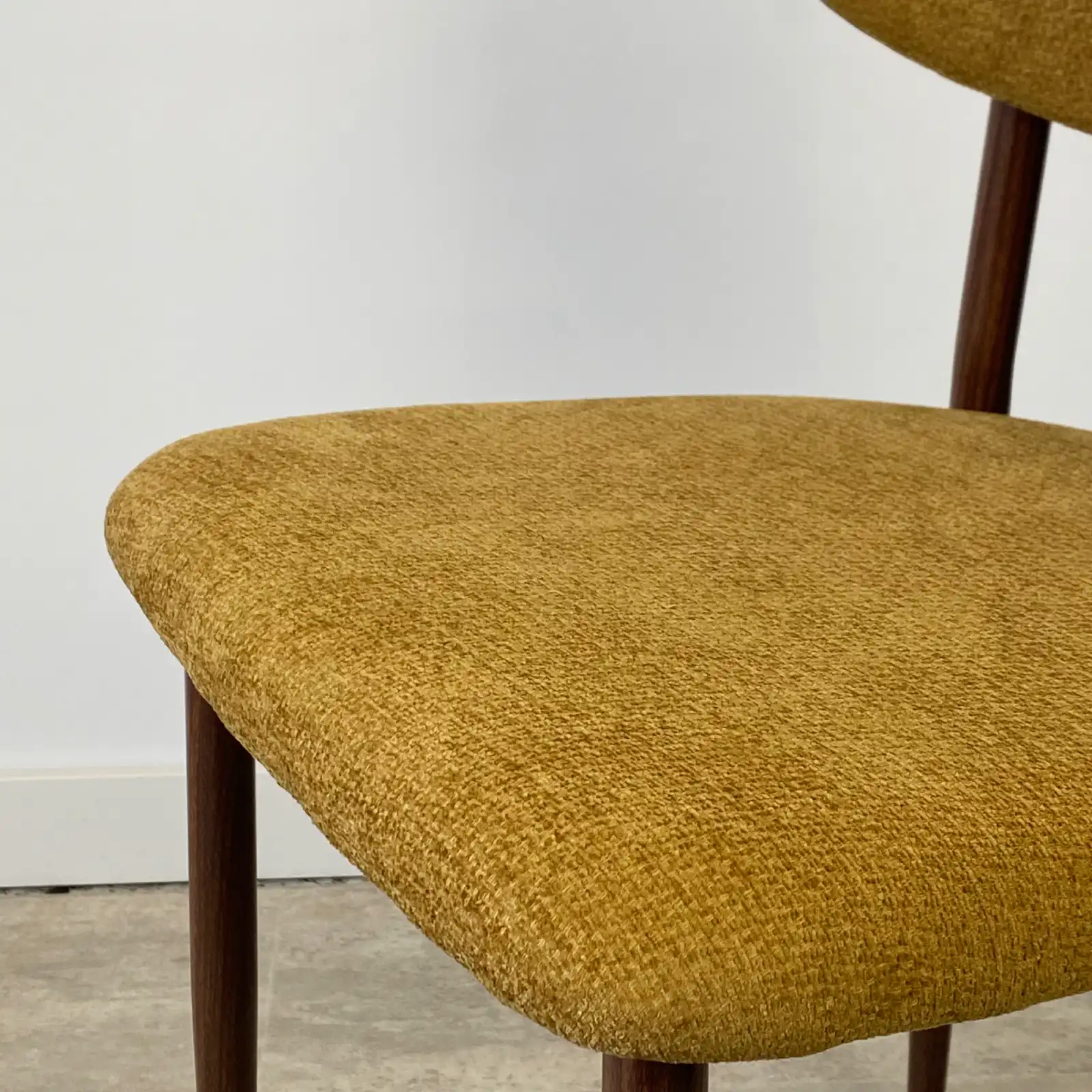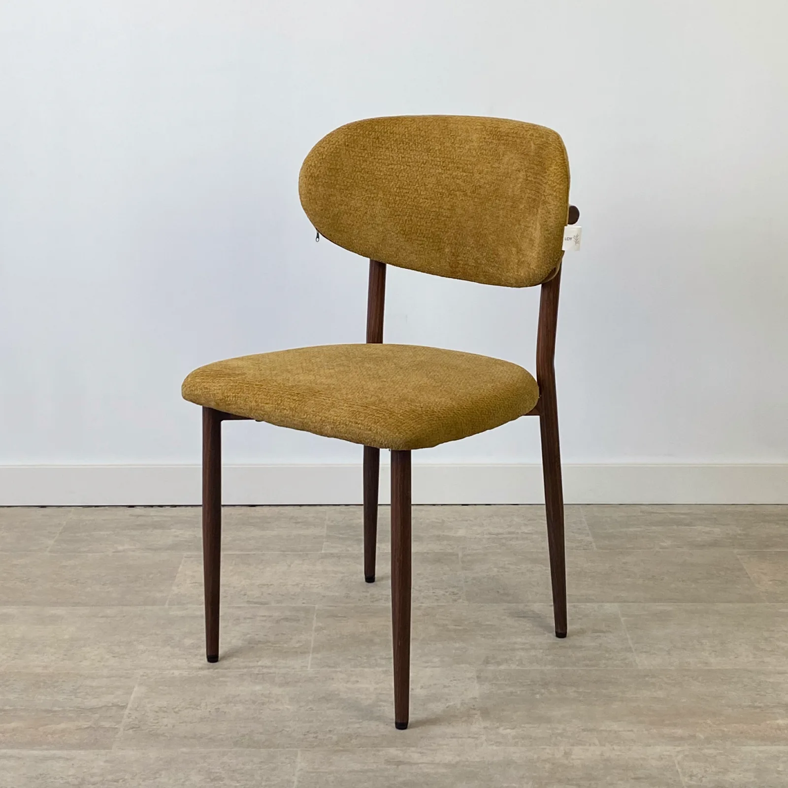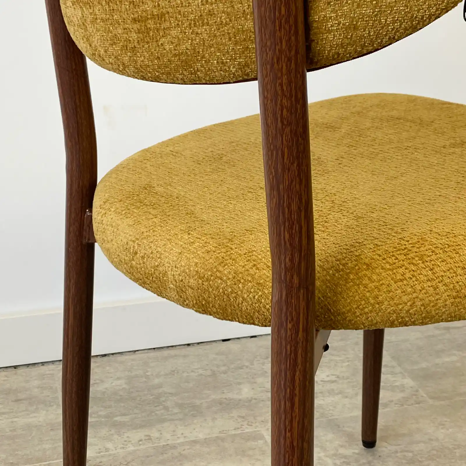 Set de 2 sillas tapizadas en color ocre tela chenilla con patas en hierro imitación madera de nogal