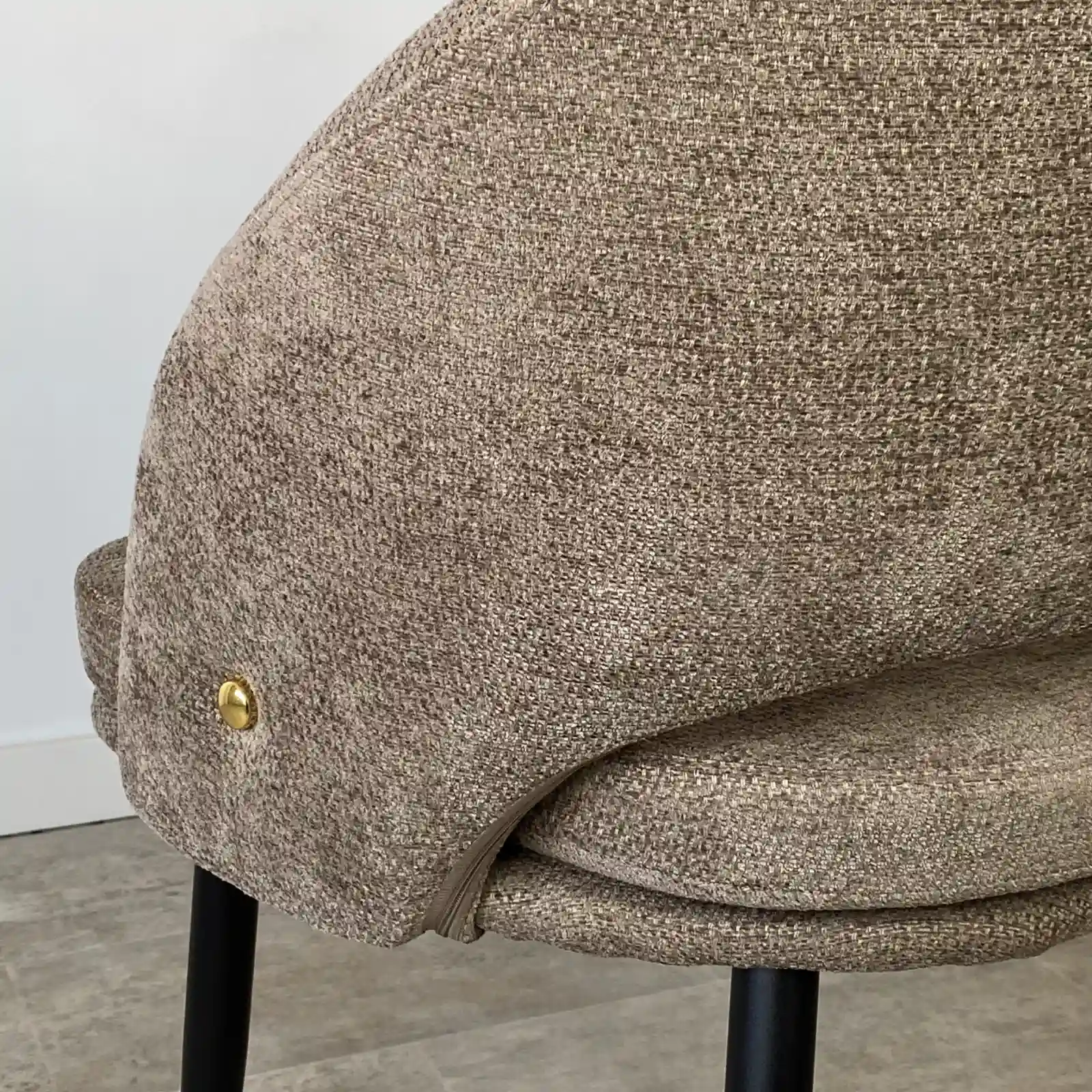 La silla BARCELONA es de esas que llaman la atención por ese aire “envolvente” que invita a sentarse nada más verla. Lo que más nos gusta es que está tapizada en tela chenilla de color taupe; este tejido no solo es súper suave al tacto, sino que tiene ese relieve característico que le da un punto de calidez y resistencia. El respaldo es curvo con abertura que la hace visualmente más ligera. Sus patas negras, finas y estables, le dan ese contraste que combina genial tanto con mesas de madera como con estilos más industriales.